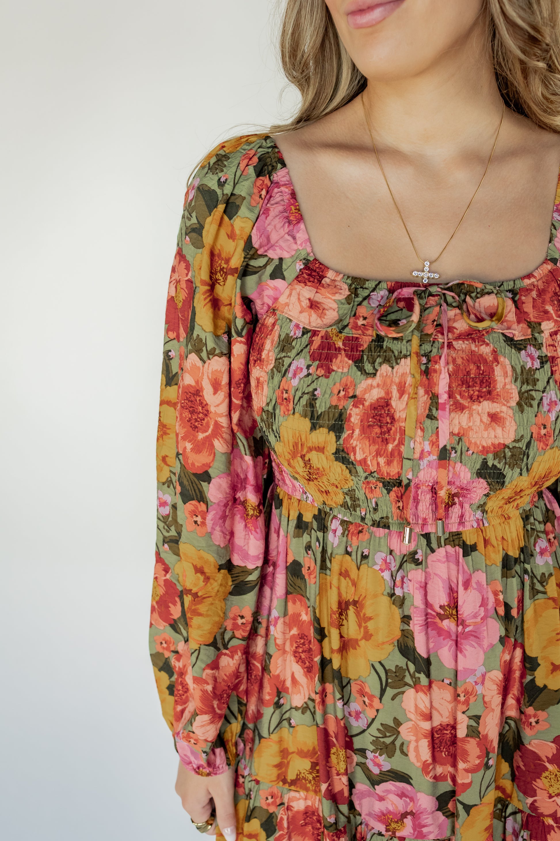 Add playful pops of floral color with the Bold Floral Smocked Maxi in sage multi. Featuring a smocked back for a comfy fit and elastic wrists that keep the long sleeves perfectly in place, this dress blends fun details with easygoing style. Perfect for days when you want to stand out with effortless charm.