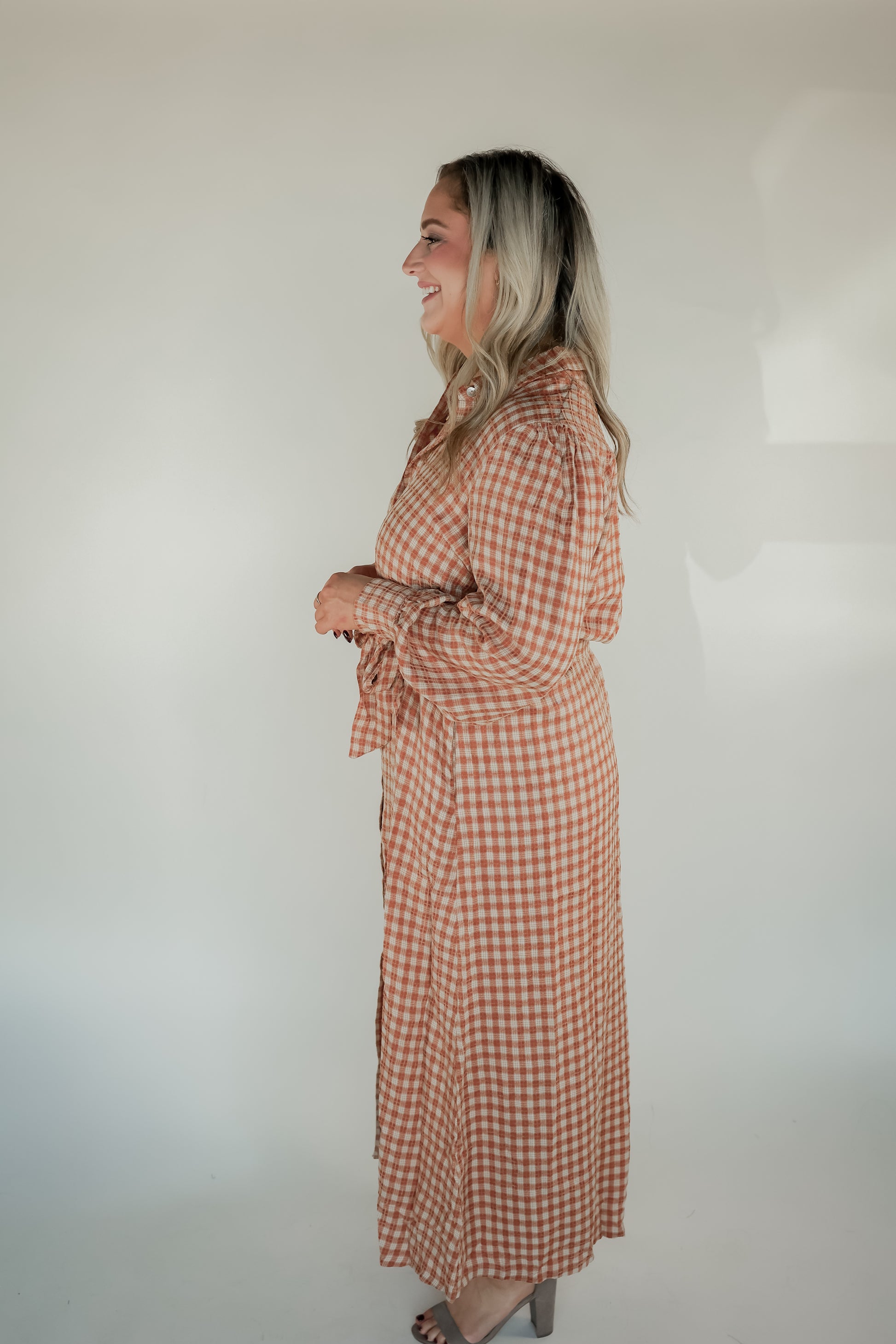 Celebrate the season in the Gracie Gingham Dress, featuring a beautiful rust color and playful oversized fit. Midi-length with functional buttons, it’s perfect for holiday gatherings or everyday fun. Comfortable yet stylish, this dress brings effortless charm to your wardrobe.