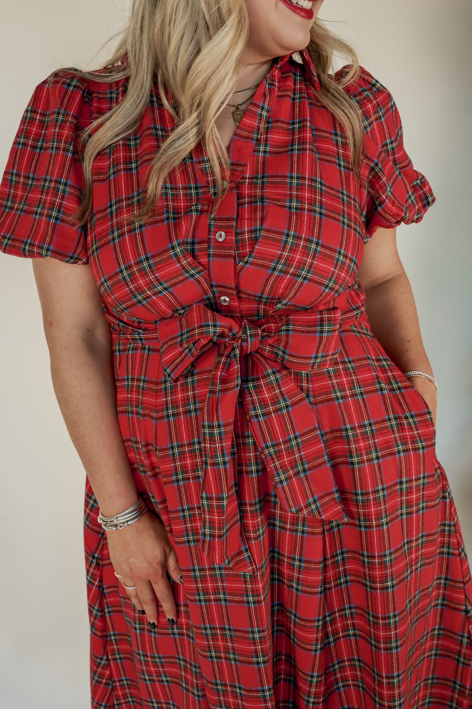 Step into the season with the Meet Me at the Mistletoe Midi Dress—an irresistibly charming piece that captures holiday magic. The classic Christmas plaid pattern brings festive warmth, while a perfectly placed bow cinches the waist to create a flattering, feminine silhouette. This adorable dress transitions seamlessly from holiday parties to cozy gatherings, offering the ideal balance of playful style and timeless elegance. Whether you're celebrating with loved ones or creating memorable moments, this dress ensures you'll look and feel absolutely radiant all season long.