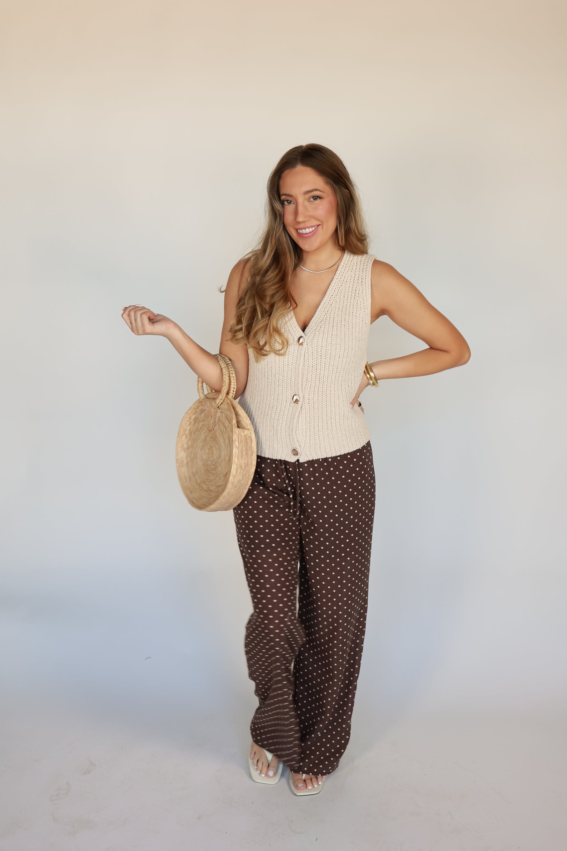 Add a touch of coastal charm with The Sand + Shell Sweater Vest, a delightful layering piece in warm sand tones finished with adorable gold shell buttons. This vest brings effortless sophistication and whimsical detail to any outfit. The soft, neutral sand color pairs beautifully with everything in your closet, while the charming shell button accents add personality and seaside-inspired elegance. A versatile essential that transforms basic looks into something uniquely stylish and undeniably charming.